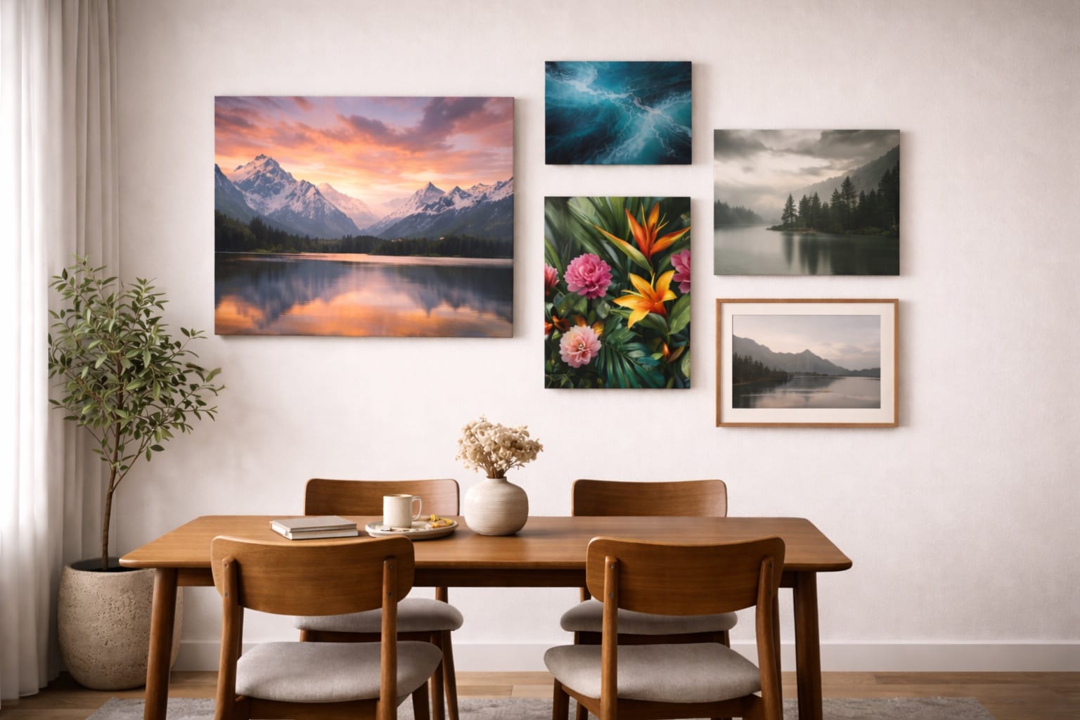 Kombinieren Sie verschiedene Materialien und Formate zu einer einzigartigen Bilderwand, die Ihren persönlichen Stil widerspiegelt.